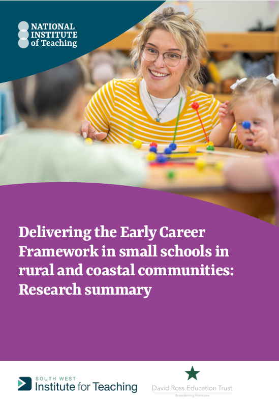 This document is for schools and training providers of Early Career Framework [ECF] programmes to support teachers in their first two years of teaching (Early Career Teachers [ECTs]). It describes a research project conducted by the National Institute of Teaching [NIoT], the South West Institute for Teaching [SWIFT], and the David Ross Education Trust [DRET]. The project aimed to understand experiences of delivering ECF-based programmes in different school contexts across England, focusing on schools in rural and coastal communities, and particularly on small schools. It also aimed to identify great practice that these schools are using to deliver ECF programmes and support ECTs, and understand how ECF programmes can adapt to better support schools.